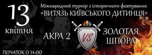 Найбільш видовищною подією в суботу, 13 квітня, стануть поєдинки й групові бої лицарів у рамках Міжнародного турніру з історичного фехтування «Витязь Київського Дитинця». На чесний бій викликали один одного команди «АКРА» (Харків-Суми, другий склад) та «Золота шпора» (Житомир). Їхні мечі швидші, ніж блискавки, а воля до перемоги міцніша заліза.
